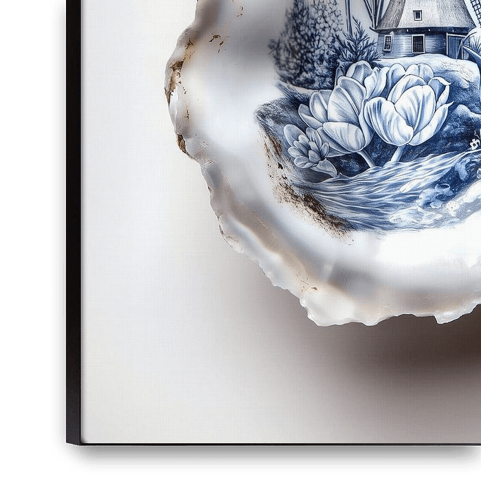Auster mit Delfter Blau Zeichnung einer holländischen Windmühle und Tulpen