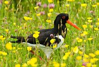 Austernfischer (Haematopus ostralegus) in einer farbenprächtigen Wiese auf Texel im Frühling.