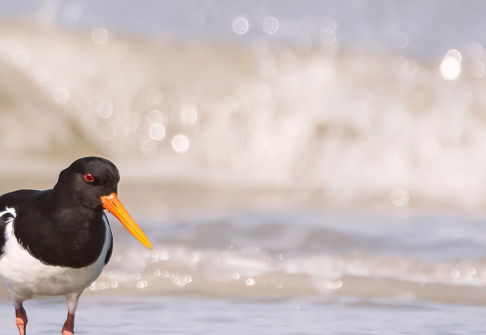 Austernfischer im Wasser auf der Suche nach Nahrung, im Hintergrund eine schöne Welle vom Meer.