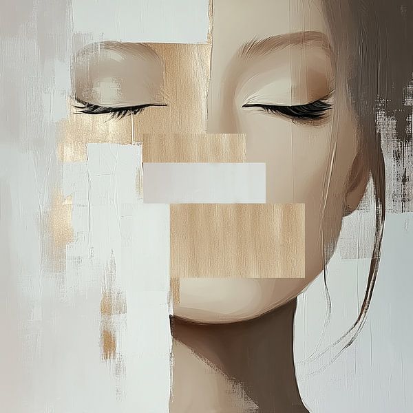 Das Bild setzt sich aus verschiedenen visuellen Fragmenten zusammen, die gemeinsam eine ruhige, fast traumhafte Komposition bilden. Auf der linken Seite sehen wir grobe, abstrakte Flächen in Weiß und zartem Beige, als seien Teile des Gesichts noch nicht vollständig enthüllt. Diese Fragmente wirken fast wie mit breiten Pinselstrichen…