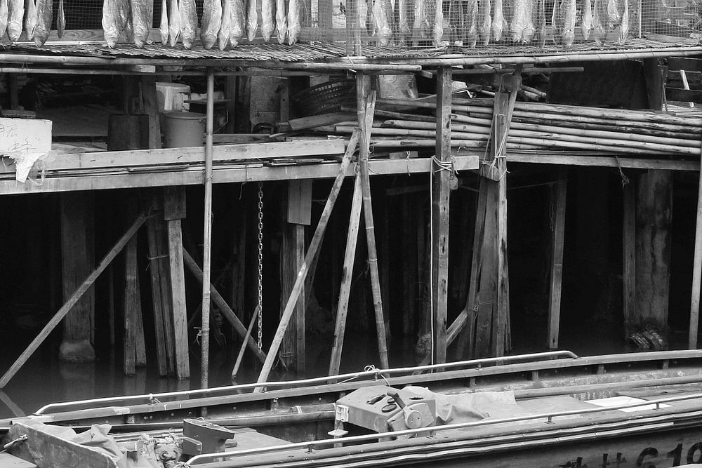 Alte hölzerne Fischerhäuser auf Stelzen, Stelzenhäuser, chinesische Boote, Fischerboote im traditionellen Fischerdorf Tai O, Lantau Island, Hongkong, Hong Kong, China. Die Menschen hier leben vom Fischfang und vom Fischen. Der Ozean beherbergt eine große Vielfalt an Meereslebewesen. Fische hängen zum Trocknen auf den Balkonen. Getrockneter Fisch ist eine typisch asiatische Delikatesse.