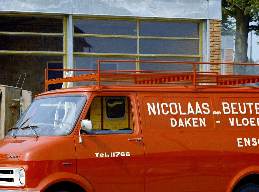 (C)Roel Dijkstra - Foto Bart HofmeesterInszeniertes Werbefoto aus dem Jahr 1970, mit freundlicher Genehmigung von General Motors (GMC) und Bedford. Nicolaas und Beute NV aus Enschede, Unternehmen für Dächer und Fußböden.GMC-7592Bedford Farbe