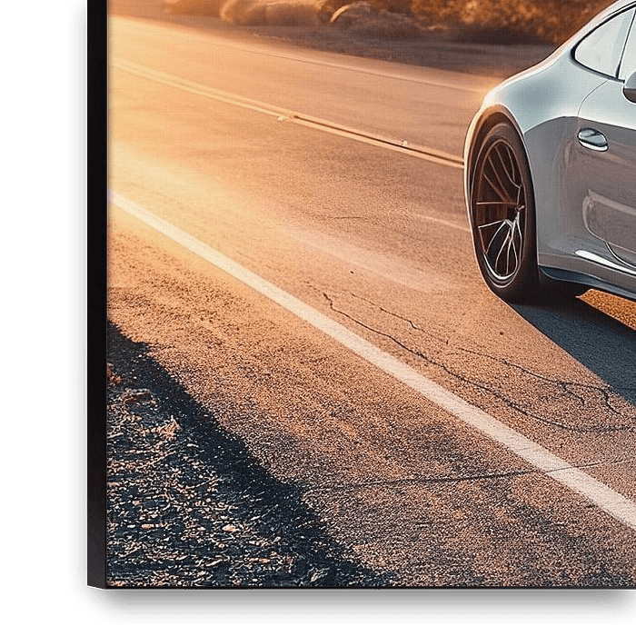 Ein tolles Sportwagen Wandbild für echte Auto Fans. Ein Auto Car im leichten Sonnenuntergang auf einem einsamen Highway. Das perfekte Poster für alle Auto Fahrer.
