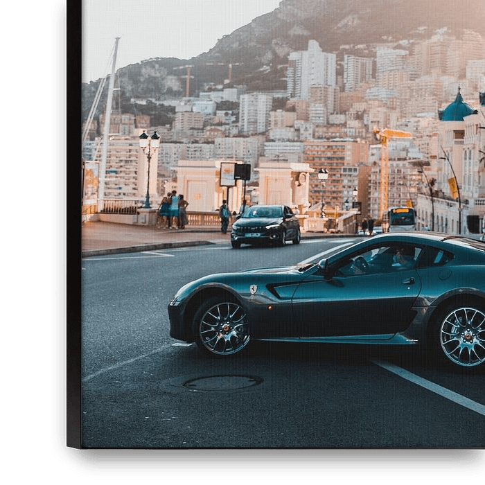 Ein Auto in den schönen Straßen von Monaco, mit der Sonne hinter den Bergen. Ich habe dieses Bild bereits in schwarz-weiß, aber in Farbe kann man auch die schönen Gebäude und die Atmosphäre der Stadt sehen.