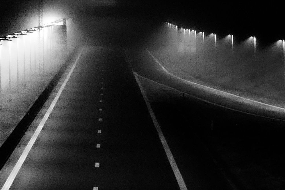Dieses Bild zeigt eine Autobahn bei Nacht mit ausgeprägter Beleuchtung auf dem Mittelstreifen und der Auffahrt. Der Aussichtspunkt liegt inmitten des Donners und Nebels. Der Nebel hat in der Höhe der Lichter einen stimmungsvollen Charakter. Monochromes Arbeiten (Schwarz/Weiß)