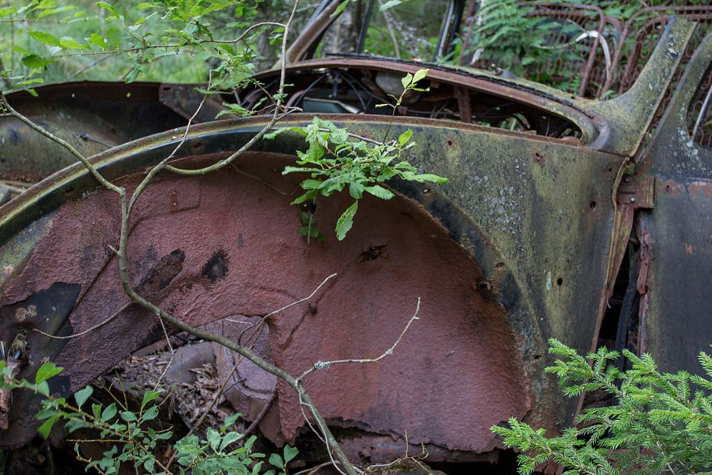 Friedhof in einem Wald in Ryd, Schweden. Über den Wald verstreut sind Autos aus den 40er und 50er Jahren als alter Schrott zum Verrotten.