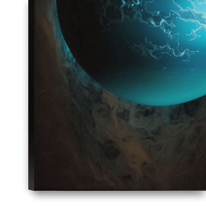 Das Bild zeigt eine atemberaubende Himmelsszene mit einem massiven, azurfarbenen Gasriesen, der in den Tiefen des Weltraums schwebt. Die Oberfläche des Planeten ist eine faszinierende Mischung aus tiefem Blau und leuchtendem Türkis, durchzogen von leuchtenden elektrischen Gewittermustern, die sich durch die dichte, wirbelnde Atmosphäre…