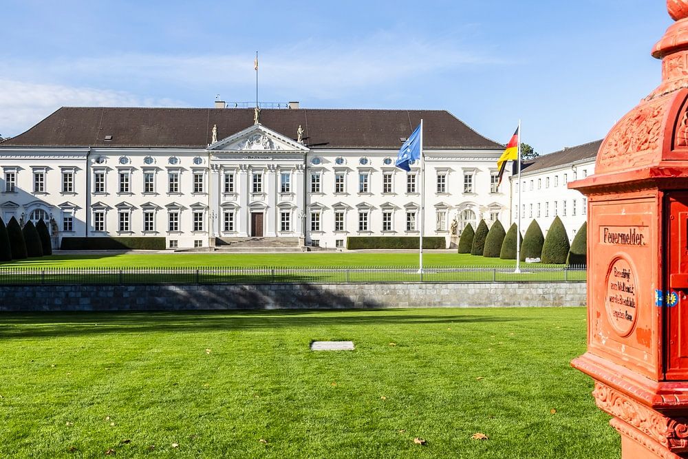 Impression der eleganten Front des Schlosses Bellevue. Der Amtssitz des deutschen Bundespräsidenten liegt am nördlichen Rande des Großen Tiergartens in Berlin. Im Vordergrund steht eine auffällige historische Feuermeldebox in leuchtendem Rot. Sie bildet einen reizvollen Kontrast zur eleganten weißen Fassade des klassizistischen…
