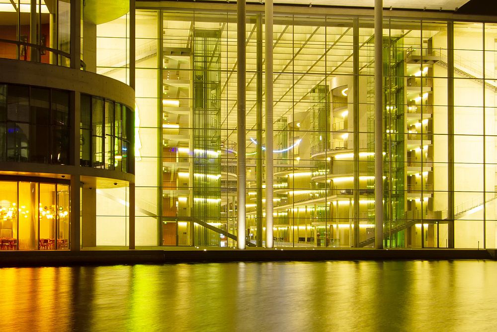 Nachtaufnahme mit schöner Spiegelung der Glasfassade in der Spree.