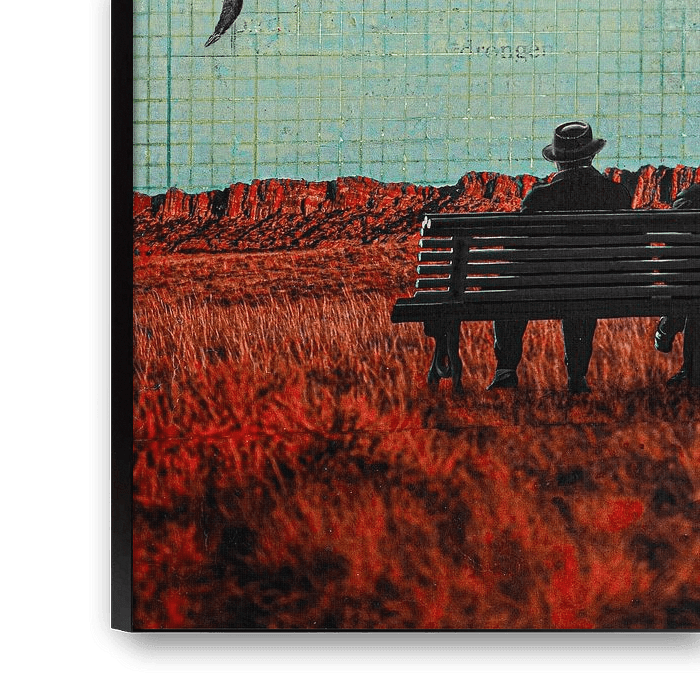 BIRDS OF A FEATHER ist ein Landschaftsgemälde, das Natur, Zeit und Kameradschaft widerspiegelt. Das Gemälde zeigt zwei alte Männer, die auf einer Bank in einer rotbraunen Wüstenlandschaft sitzen. Sie blicken auf die Berge in der Ferne und denken über die Zeit nach.