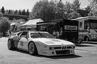 BMW M1 Oldtimer-Rennwagen im Fahrerlager der Rennstrecke von Spa Francorchamps. Der BMW M1 E26 war das erste von der BMW Motorsport GmbH entwickelte Fahrzeug und wurde von 1978 bis 1981 als Homologationsfahrzeug in Zusammenarbeit mit Lamborghini produziert. Schwarz-Weiß-Foto.