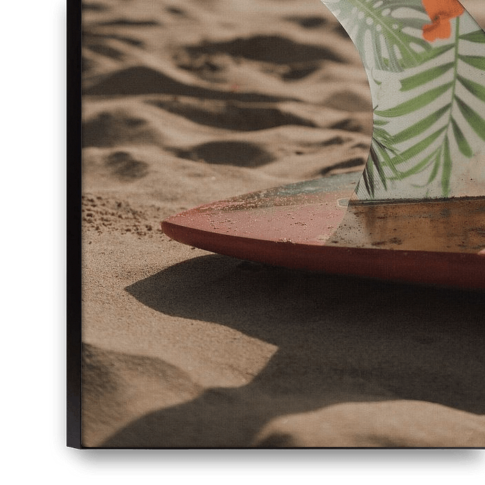 Surfboard liegt auf einem warmen Strand mit nach oben gerichteter Single Fin und einem grünen tropischen Print-Inlay, im Hintergrund eine schöne Silhouette einer Bergformation.