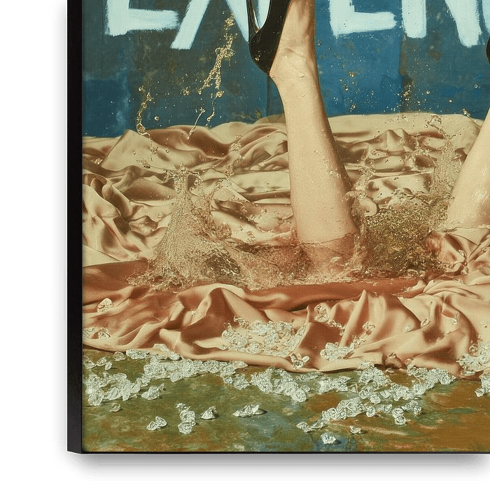 Ein verspieltes und kraftvolles Bild, in dem Luxus und Ironie aufeinandertreffen. Die Beine ragen aus einer glänzenden Oberfläche aus Stoff und Flüssigkeit empor, als würde sich der Körper durch eine Welt der Üppigkeit bewegen. Die hohen Absätze betonen die Silhouette und verleihen dem Bild eine klare, fast grafische Form.