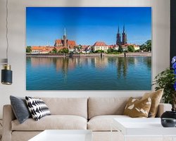 Breslau ist die viertgrößte Stadt in Polen und ist Hauptstadt von Niederschlesien. Sie ist im Jahr 2016 Kulturhauptstadt Europas. Hier ein Blick vom Oderufer in Breslau auf die Dominsel mit der Stiftskirche zum Heiligen Kreuz und St. Bartholomäus sowie dem Breslauer Dom.