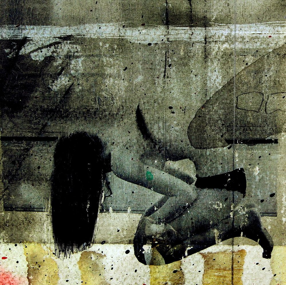 Gemischte Medien und Montage auf Papier. Dieses Werk gehört zur Serie 'Collagen'. Die Collagen sind mit allen möglichen Fotos, Bildern und Darstellungen aufgebaut, die ich im Laufe der Jahre gesammelt habe. Zuerst male ich einen Grund mit Aquarell- oder Acrylfarbe und bearbeite ihn mit Stempeldruck, Farbspritzern und Kritzeleien. Dann wird die Collage in Schichten aufgetragen und manchmal losgezogen, um einen alten und verwitterten Effekt zu erzeugen. Durch das Übereinanderlegen der Schichten entsteht ein transparenter Effekt, wie er nur mit Aquarellfarbe möglich ist. Die ersten Schichten sind durch die Collagenebenen sichtbar. Die meisten Collagen werden mit Acrylfarbe gearbeitet, in Form von Stempeln oder einfach übermalt. Darüber hinaus zeichne ich oft mit Kugelschreiber oder Bleistift auf den Collagen. Viele kleine Details werden sichtbar, wenn das Werk auf ein größeres Format gedruckt wird.