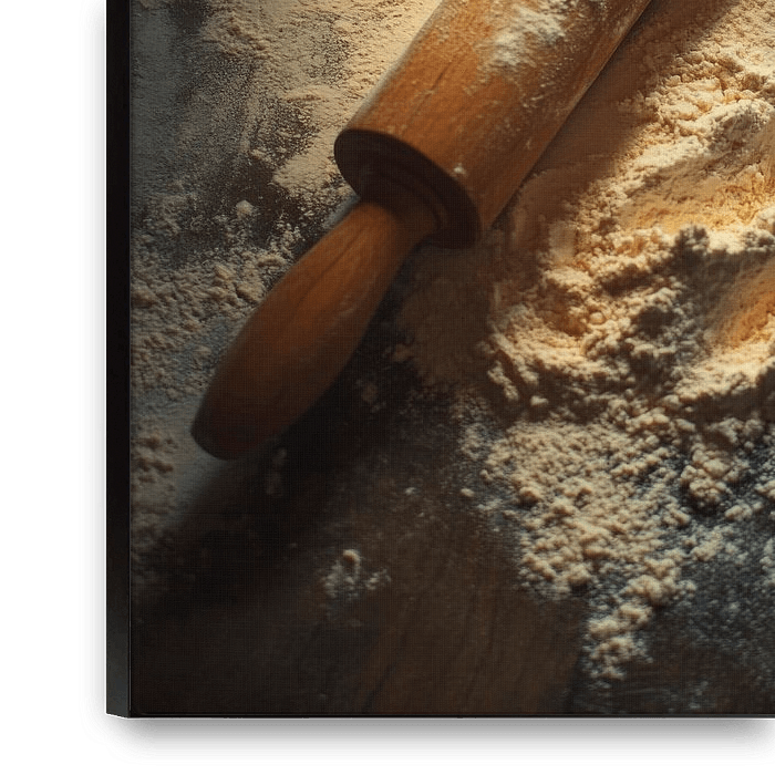 Eine rustikale Holzrolle, umgeben von einem sanften Wolkenbett aus Mehl, erzählt von herzlichen Küchentraditionen und Backabenteuern. Ihr weicher Glanz und die handwerkliche Note bringen eine einladende Atmosphäre in jede Küche. Perfekt, um den Charme des Backens und die Freude am Kochen zu zelebrieren!