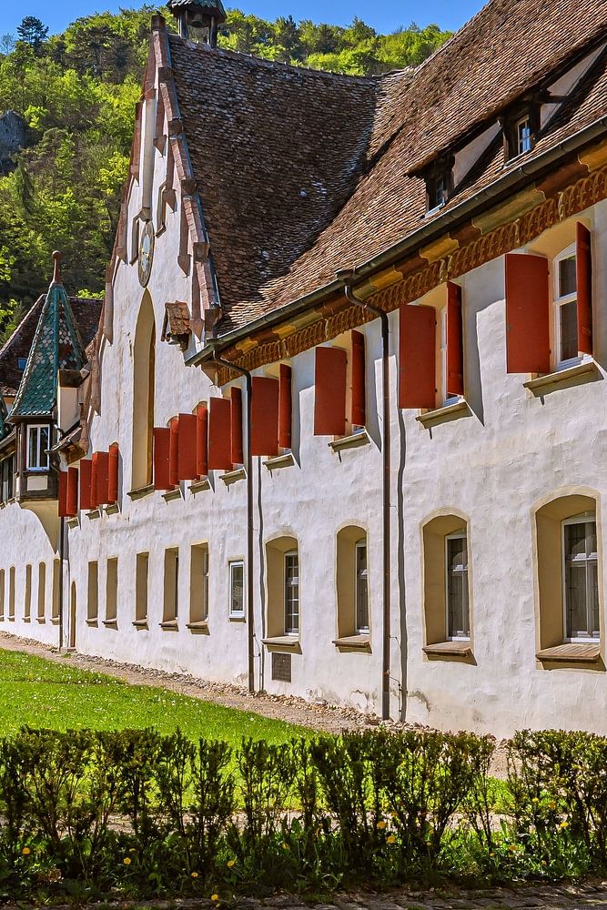 Das Bild zeigt einen sonnigen Blick auf den Klosterhof des Klosters Blaubeuren mit seinen weißen Gebäuden, roten Fensterläden und der grünen Umgebung unter einem blau-weißen Himmel. Fotografiert von Photoart-Naegele im April 2025. ( Nikon Z50ii )