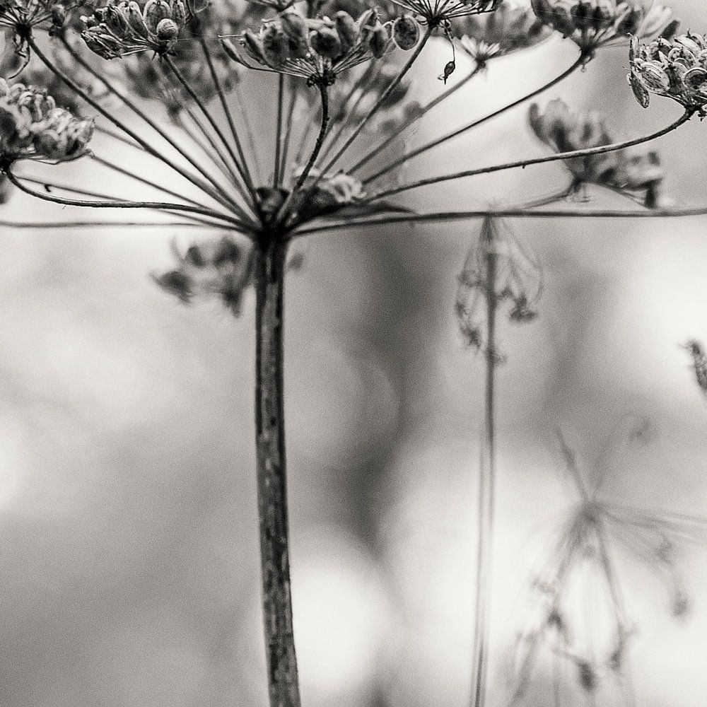 Zaunblume mit schönen getrockneten Dolden nach der Blüte. Dies ist nicht der Riesenbärenklau, der einen Saft absondert, der die Haut der Menschen verbrennt. Die Schnecke war ein kleines Extra.