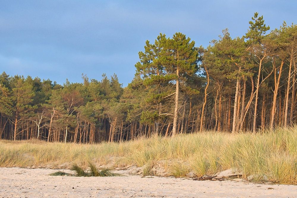 Bäume am Strand der Ostsee. Kleiner Wald. Übergang zum Meer.