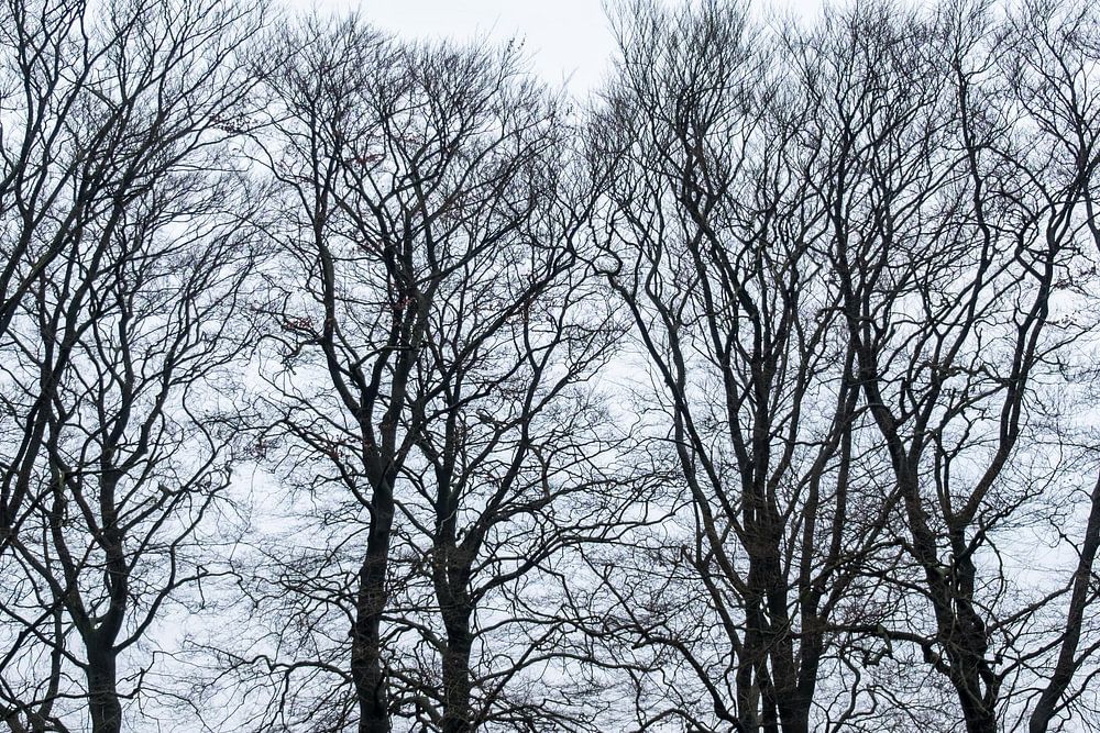 Reihenbäume im Winter ohne Blätter an der Grenze zwischen Wald und Heide. Heidekraut im Hintergrund.