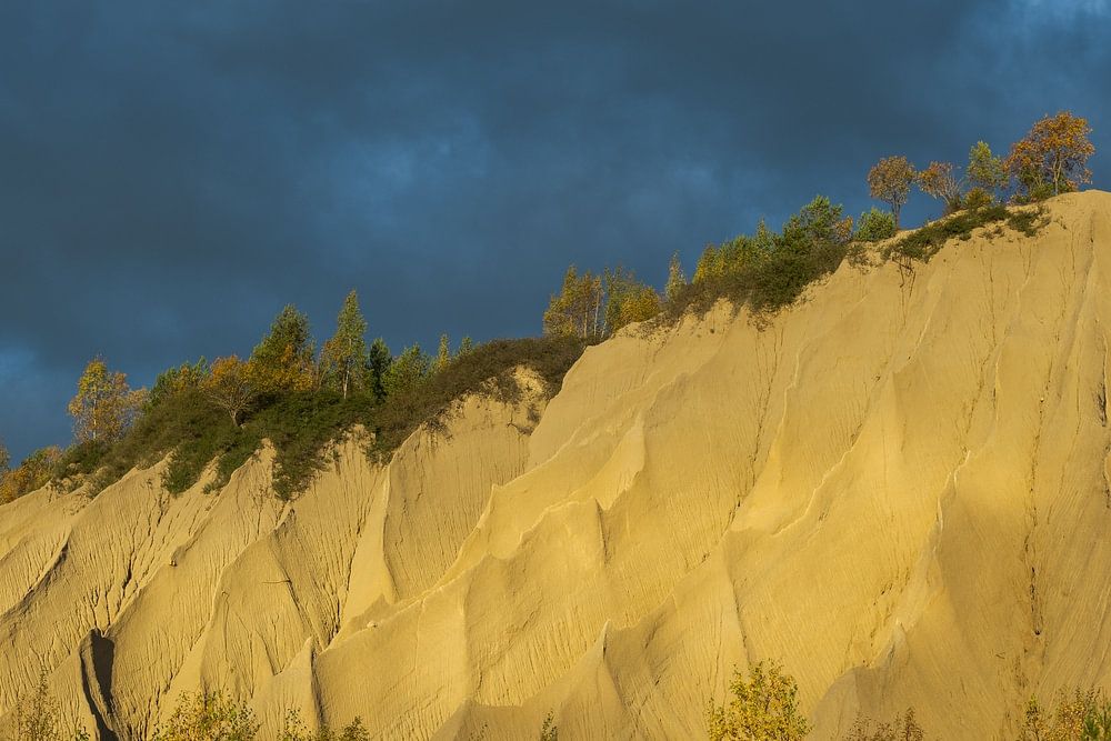 Bäume und Büsche auf großer Sanddüne im verlassenen Steinbruch Rummu in Estland bei Sonnenaufgang