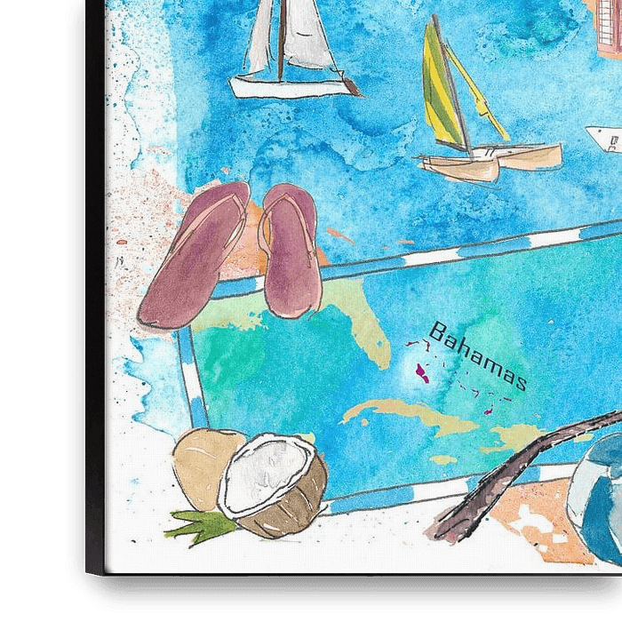 Bestelle diese Malerei Bahamas illustrierte Reise Karte mit Highlights von Markus Bleichner als Reproduktion auf Leinwand, Alu-Dibond, als Poster, Fototapete oder Acrylglasbild.