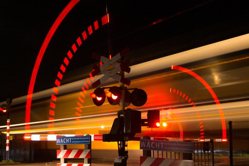 Bahnübergang in Aktion. Der vorbeifahrende Zug wird aufgrund der langen Belichtungszeit als helle Spur dargestellt. Bahnübergang bei Schardam