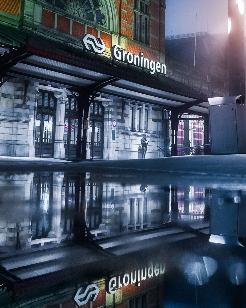Die Fassade des Groninger Hauptbahnhofs spiegelt sich im Wasser auf dem Platz. Nebel, atmosphärische Lichter, Dämmerung und ein einsamer Reisender machen dieses Bild zeitlos.
