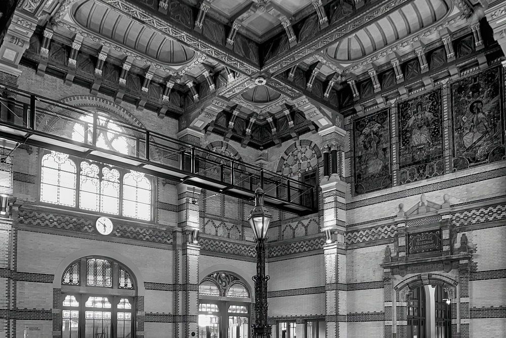 Die Bahnhofshalle von Groningen, auch "Kathedrale des geflügelten Rades" genannt, ist zweifellos der Grund dafür, dass der Hoofdstation als eines der schönsten Bahnhofsgebäude der Niederlande gilt. Groningen hat seit 1866 einen Bahnhof; das heutige Gebäude wurde Ende des 19. Jahrhunderts errichtet. In der Hektik des Alltags neigen wir dazu, von einem Ort zum anderen zu rennen und vergessen dabei, die Schönheit der Dinge zu sehen, die man sowieso kennt. Schauen Sie nach oben. Die farbenfrohen floralen Motive und architektonischen Elemente an der Decke sind aus Pappmaché gefertigt. Diese Technik war in der Vergangenheit wegen ihrer geringen Kosten und ihres geringen Gewichts nicht ungewöhnlich. Ihre Anwendung in einem so großen Maßstab ist jedoch ungewöhnlich. Außerdem ist der Saal ein so genannter 'salle des pas perdus', wörtlich ein 'Saal, in dem sich die Schritte verlieren'. Der Groninger Künstler F.H. Bach (damals Dozent an der Kunstakademie Minerva) bezieht sich hier nicht nur auf die Akustik, sondern auch auf die Funktion der Halle. Ein Wartesaal, in dem die Menschen umherwandern, um die Zeit totzuschlagen und ihre Füße mehr oder weniger nutzlos zu bewegen. Das Bild ist in schwarz-weiß gehalten.