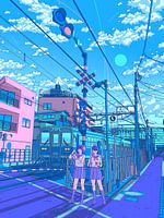 Dieses Kunstwerk fängt einen friedlichen Moment an einem japanischen Bahnübergang an einem strahlenden Sommernachmittag ein. Zwei Schulmädchen stehen gemeinsam in der Nähe der Gleise, während sich eine ruhige Vorstadtstraße in die Ferne erstreckt. Oberleitungen, Ampeln und die vertrauten Bahnübergangssignale schaffen eine Szene, die in…