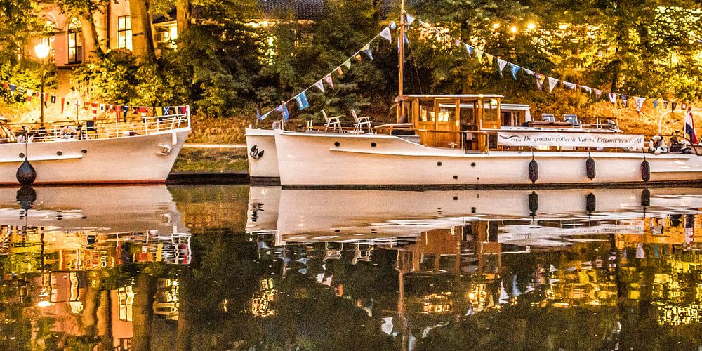 Bakdekkruisers in de stadsgracht van Leeuwarden verlicht door lantaarns en gespiegeld in het rimpelloze water ter hoogte van De Koperen Tuin.