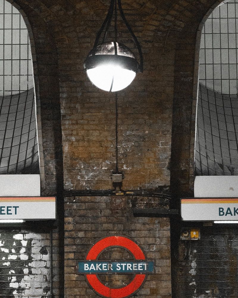 Ein Reisender wartet in der U-Bahn-Station Baker Street, London, Vereinigtes Königreich, auf seine U-Bahn. Dieser Ort ist bei Fotografen unglaublich beliebt und es ist nicht schwer zu erraten, warum.