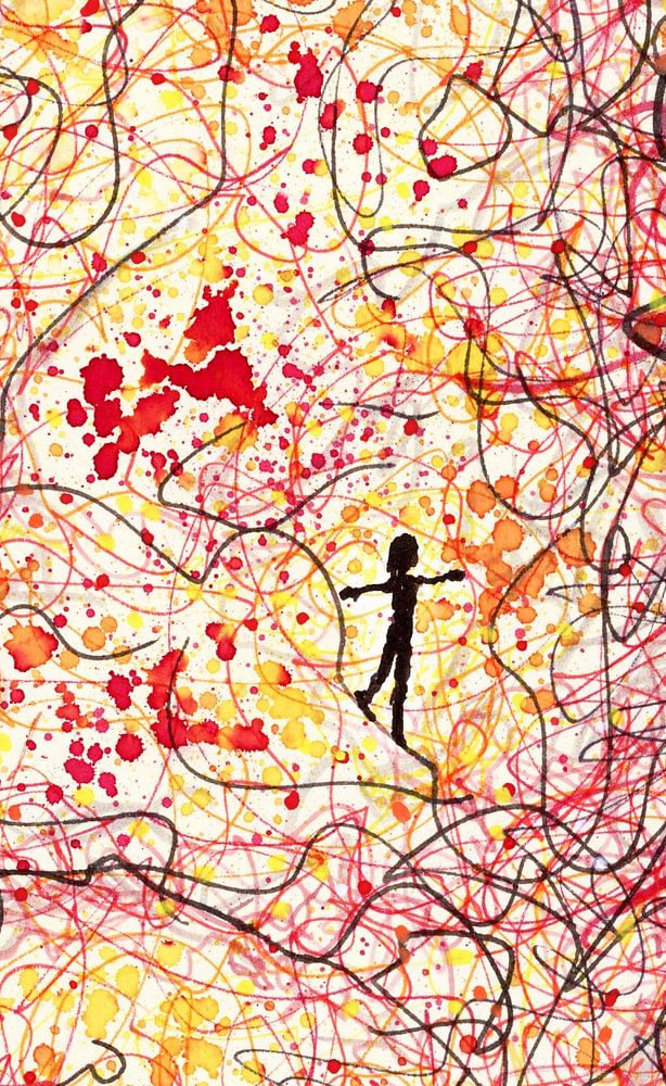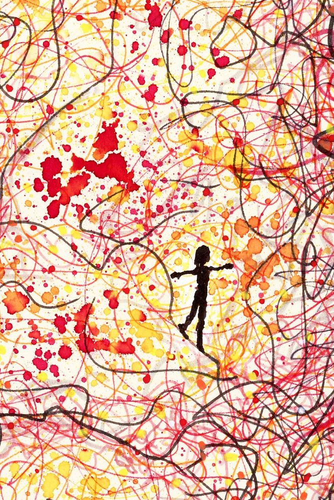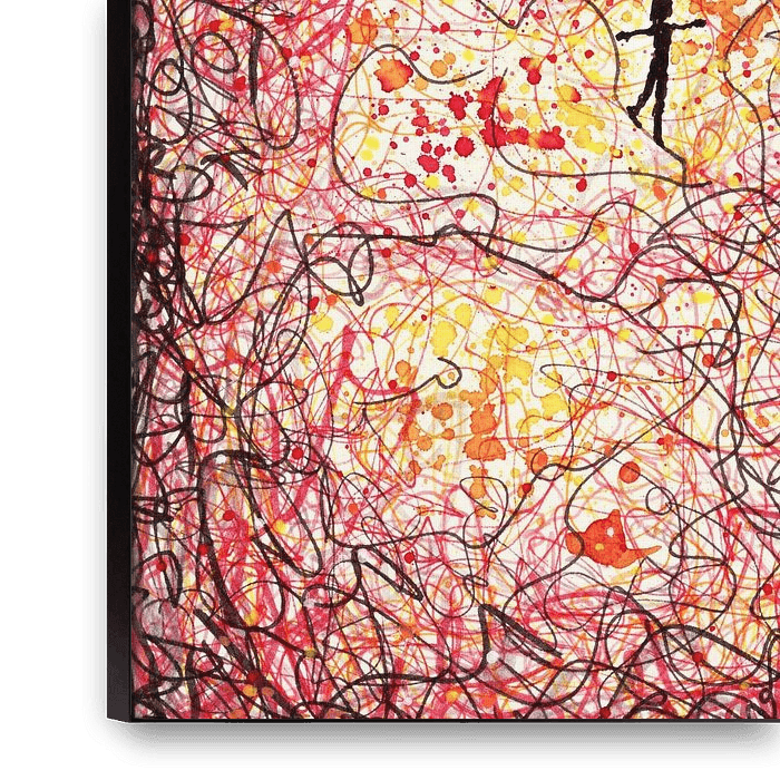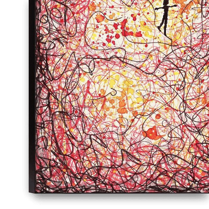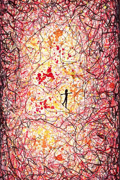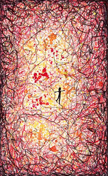 „Balans zoeken in de chaos“ (Balance im Chaos finden) ist ein faszinierender Kunstdruck, der die innere Suche nach Ruhe und Selbstbewahrung auf eindrucksvolle Weise darstellt. Das Werk zeigt eine Silhouette, die fest in der Mitte steht, umgeben von einer Explosion dynamischer Linien und warmer Farben wie Rot, Orange und Rosa. Dieses…