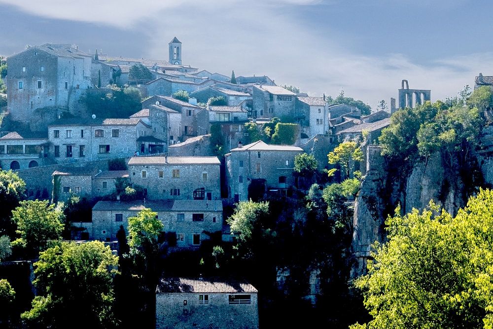 Balazuc liegt in der Mitte der Ardèche-Region. Ein schönes altes Dorf auf einem Hügel am Fluss Ardèche. Dieses Foto wurde aus der Ferne aufgenommen und zeigt das ganze Dorf. Alte Gebäude in einer wirklich fantastischen Umgebung.