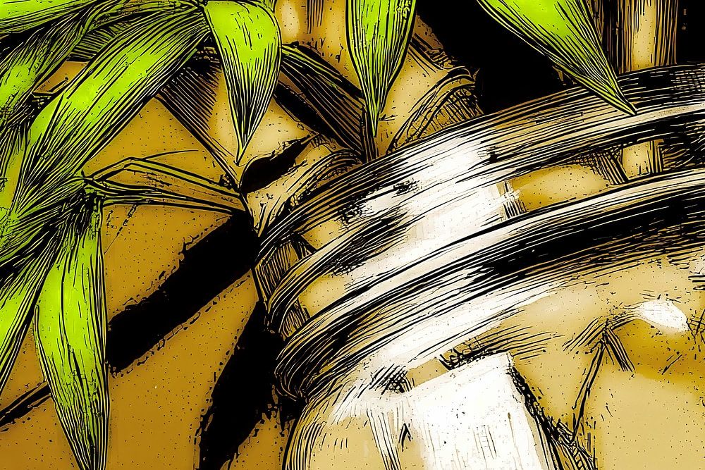 Dieses Kunstwerk fängt die schlichte Schönheit von Bambuspflanzen ein, die in einem Glasgefäß arrangiert sind, und präsentiert sie in einem stilisierten, fast grafischen Stil. Die leuchtend grünen Blätter und die robusten Stängel des Bambus stehen im Mittelpunkt, ihre Formen sind klar definiert und mit feinen Linien akzentuiert, die an eine botanische Illustration erinnern. Das Glasgefäß, ein einfaches Einmachglas, ist ebenfalls mit präzisen Linien dargestellt, die seine Transparenz und die Reflexionen des Lichts auf seiner Oberfläche andeuten. Der Hintergrund ist in einem warmen, erdigen Goldbraun gehalten, das einen harmonischen Kontrast zum frischen Grün des Bambus bildet. Subtile Texturen und Schattierungen im Hintergrund verleihen dem Bild Tiefe, ohne von den Hauptmotiven abzulenken. Die Komposition ist nah und intim, wodurch der Betrachter die feinen Details der Blätter und die Struktur des Glases genau betrachten kann. Das Licht scheint von oben zu kommen und erzeugt sanfte Glanzpunkte auf den Blättern und dem Glas. Das Kunstwerk strahlt eine ruhige, natürliche Ästhetik aus, die an japanische oder minimalistische Designprinzipien erinnert. Es ist eine Hommage an die Einfachheit und die organische Schönheit der Natur, die selbst in einem alltäglichen Objekt wie einem Glasgefäß zur Geltung kommt. Dieses Bild wäre eine ideale Ergänzung für Räume, die eine beruhigende, natürliche Atmosphäre oder einen Hauch von fernöstlicher Eleganz suchen.