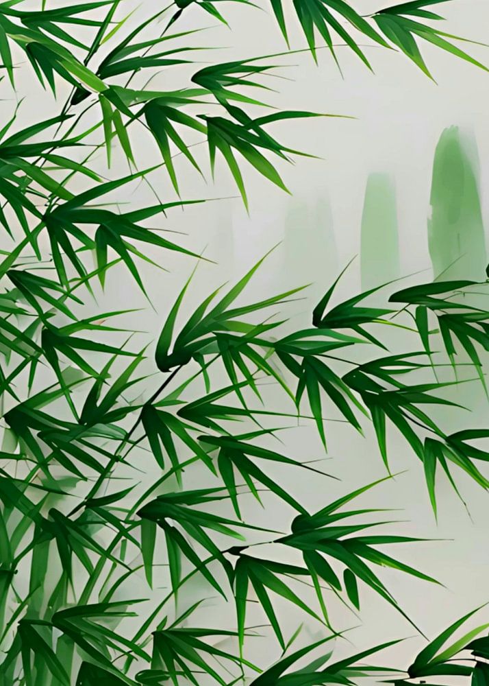 Ein zartes Aquarell stellt einen üppigen Bambuswald dar. Das Bild zeigt eine Gruppe von hohen, schlanken Bambushalmen in verschiedenen Grüntönen, deren Blätter sich dem Betrachter entgegenstrecken. Der Hintergrund ist von einem weichen, dunstigen Grün, das eine neblige Atmosphäre suggeriert. Das Gemälde vermittelt ein Gefühl der Ruhe und Gelassenheit und fängt die Schönheit der Natur in einem minimalistischen Stil ein.