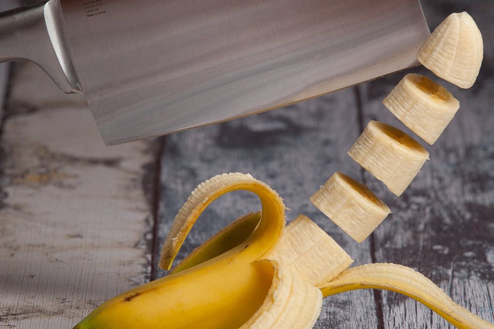 Een heerlijke banaan die is stukjes gehakt wordt. De stukjes lijken te zweven.