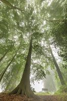 Bank unter Buchen. Nebel, Frühling, 's-Graveland, Niederlande