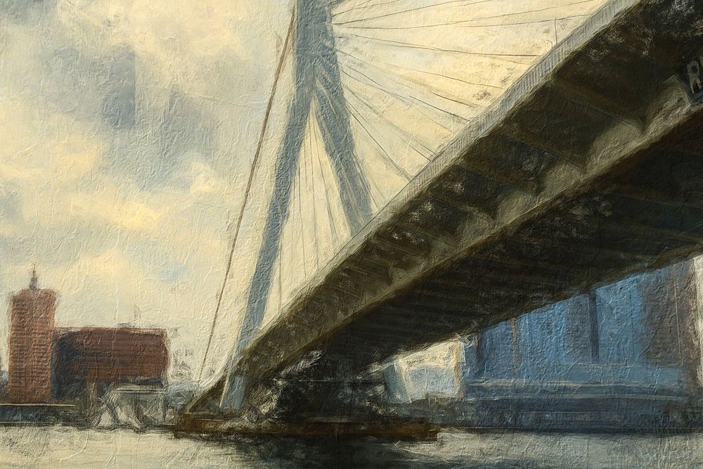 In diesem Gemälde habe ich versucht, die einzigartige Atmosphäre und Energie von Rotterdam einzufangen. Die imposante Erasmusbrücke mit ihren eleganten Linien und ihrer beeindruckenden Konstruktion ist das kraftvolle Herzstück der Szene. Sie spannt sich als Symbol für Verbindung und Fortschritt über das Wasser, während der wolkenverhangene Himmel über ihr eine dramatische, fast poetische Atmosphäre hervorruft. Die Spiegelungen im Wasser und die umgebenden modernen Gebäude verstärken das Gefühl einer Stadt, die ständig in Bewegung ist und doch auch Momente der Ruhe und Schönheit hat.