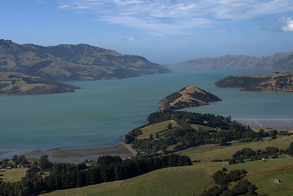 Mit Blick auf die Buchten von Banks Peninsula, von Summit Road. Banks-Halbinsel ist eine Halbinsel im Pazifischen Ozean, in der Nähe von Christchurch . Es ist eine schöne dünn besiedelten Hügel, wo man an jeder Ecke zu herrlichen Blick behandelt werden. Neuseeland auf höchstem Niveau.