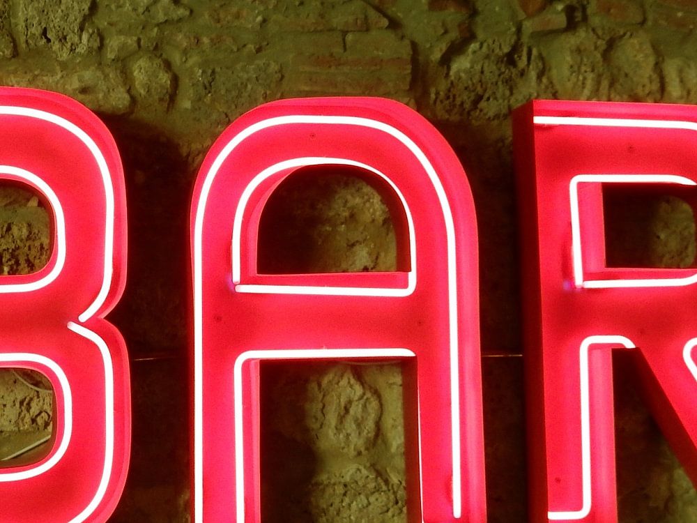 Ein großes rotes Barschild an der Innenwand einer Bar in Cetona, Italien. Es ist eher Teil der Inneneinrichtung als ein äußeres Zeichen, das den Besucher anlockt. Vielleicht ein schrulliges Stück für Ihre Wand?