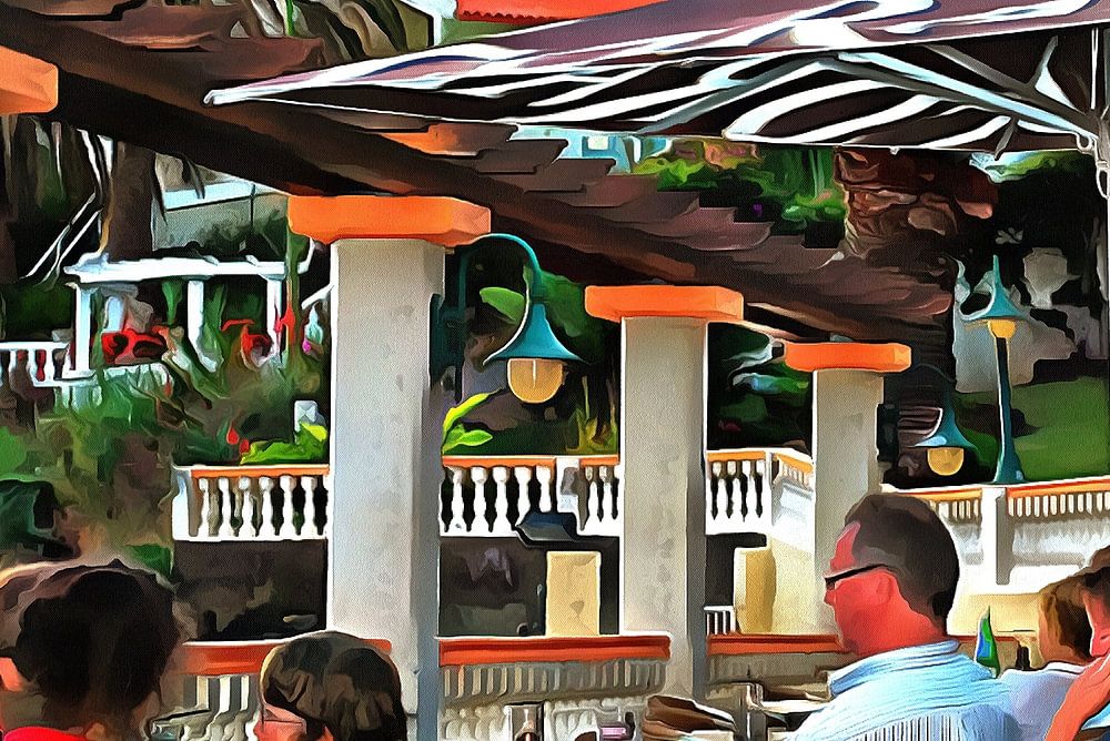 Auf diesem Fotokunstbild haben sich mehrere Gruppen von Menschen auf einer Sitzterrasse versammelt und Getränke bestellt, um sie nach einem langen Sightseeing-Tag zu genießen. Umgeben von tropischen Pflanzen und mit Blick auf die Säulen, die die Dachkonstruktion stützen, haben sie einen ungehinderten Blick auf das Meer.
