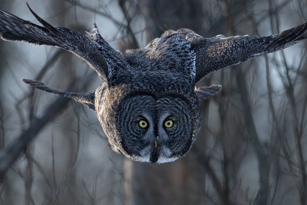 Bartkauz, fotografiert in Kanada bei Sonnenaufgang. Januar 2025 in der Region Ontario. Lightroom-Rauschreduzierung angewendet.