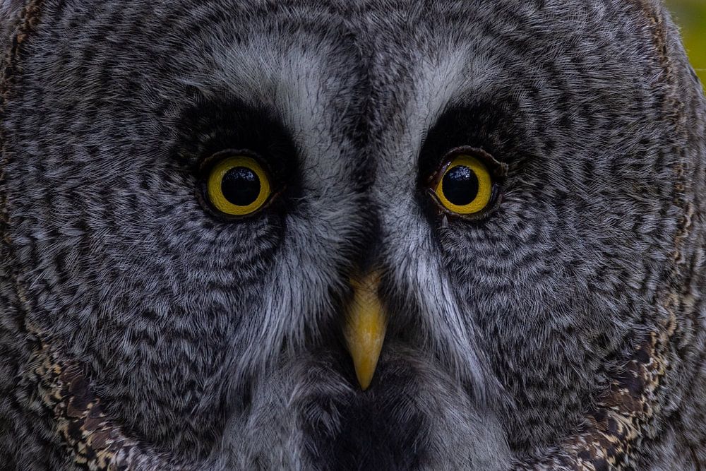 Dieses beeindruckende Portrait zeigt einen Bartkauz inmitten eines stillen Waldes. Mit seinem dichten, graubraunen Gefieder und der markanten kreisförmigen Gesichtszeichnung wirkt er wie ein uralter Wächter der Natur. Besonders eindrucksvoll stechen seine intensiv gelben Augen hervor, die den Betrachter unmittelbar fesseln und eine geheimnisvolle Ausstrahlung erzeugen.