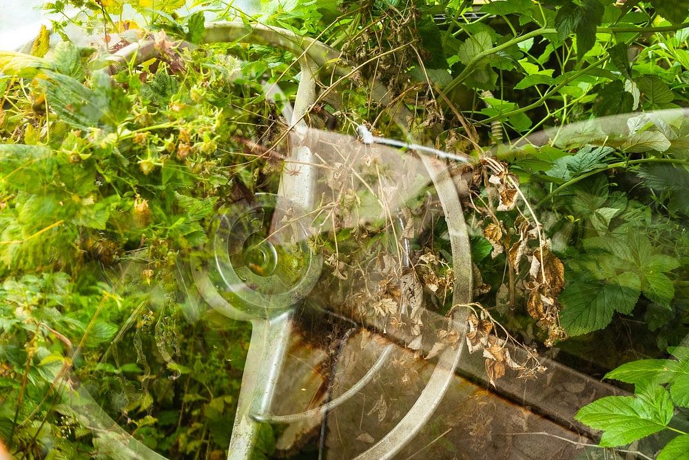 ein altes Auto auf dem Schrottplatz, das von Pflanzen überwuchert ist