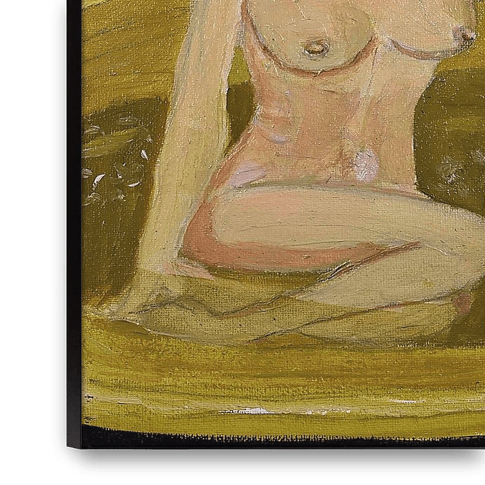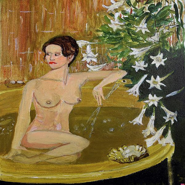 Technik: Ölfarbe auf Leinwand. Zu sehen ist eine Frau in der Badewanne. Sie stützt sich mit einem Arm auf den Wasserhahn, der die Badewanne füllt. Batseba ist eine biblische Figur. Sie wurde von König David beobachtet, als sie in der Badewanne saß. Das Gemälde ist einer Fotografie in einer Anzeige eines Badezimmerspezialisten entnommen.