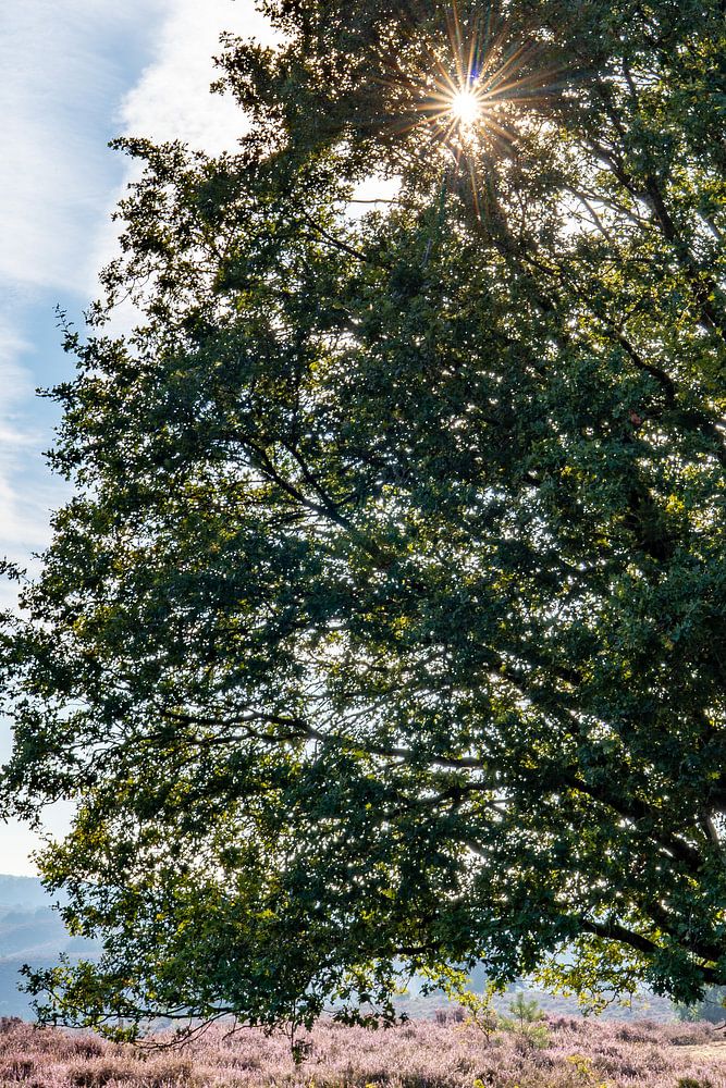 Die Sonne geht am Morgen hinter diesem ikonischen Baum auf der Veluwe in der Nähe der Posbank wunderschön auf.