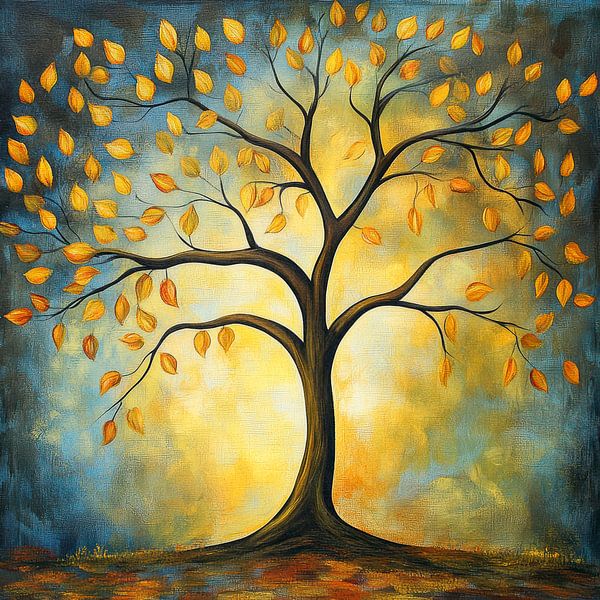 Ein Baum mit weit ausladenden Ästen ist mit leuchtend goldenen Blättern geschmückt. Der Hintergrund ist eine Mischung aus tiefem Blau und hellem Gelb, wodurch ein glühender Effekt um den Baum herum entsteht.