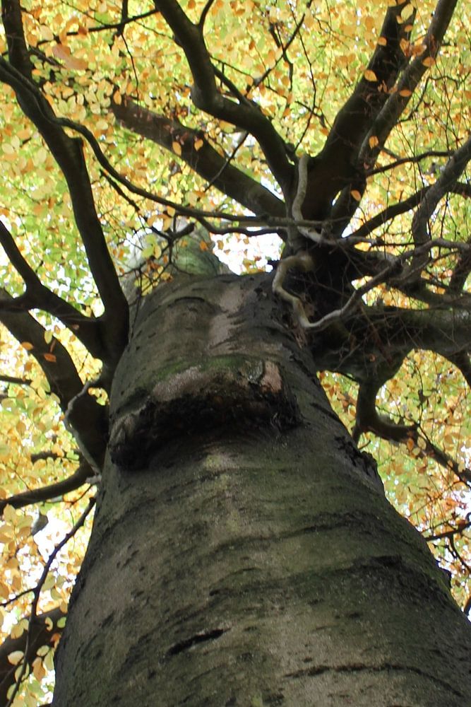 Lassen Sie Ihren Blick von den Wurzeln des Baumes über den dunklen Stamm bis in die leuchtend grüne Baumkrone schweifen. Original Naturfotografie von Christine aka stine1.