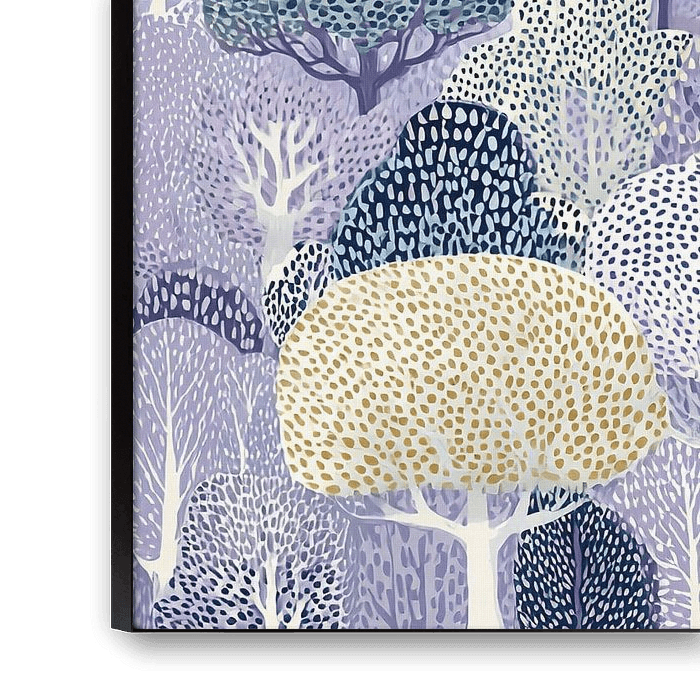 Tree Landscape | Colorful Tree Wonderland - Dieses abstrakte Gemälde zeigt eine bezaubernde Waldlandschaft voller bunter Bäume in verschiedenen Formen und Mustern, darunter sanfte Lila-, Grün- und Goldtöne, die zusammen eine heitere Atmosphäre schaffen.
